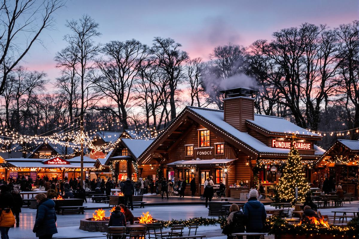 Le clou du spectacle ? Le chalet à fondue installé au centre du village. Ce n’est pas un simple restaurant éphémère, c’est un cocon douillet en bois avec cheminée et vaisselle rustique. Il peut accueillir jusqu’à 120 personnes dans un décor ultra cosy.