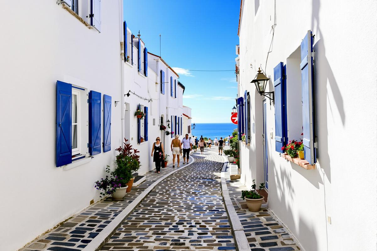 Dès l’arrivée par le ferry, le voyage surprend. Face à vous, un village scintille sous le soleil. Les maisons basses blanchies à la chaux, les volets bleus claquant au vent marin… tout rappelle l’architecture typique des Cyclades.