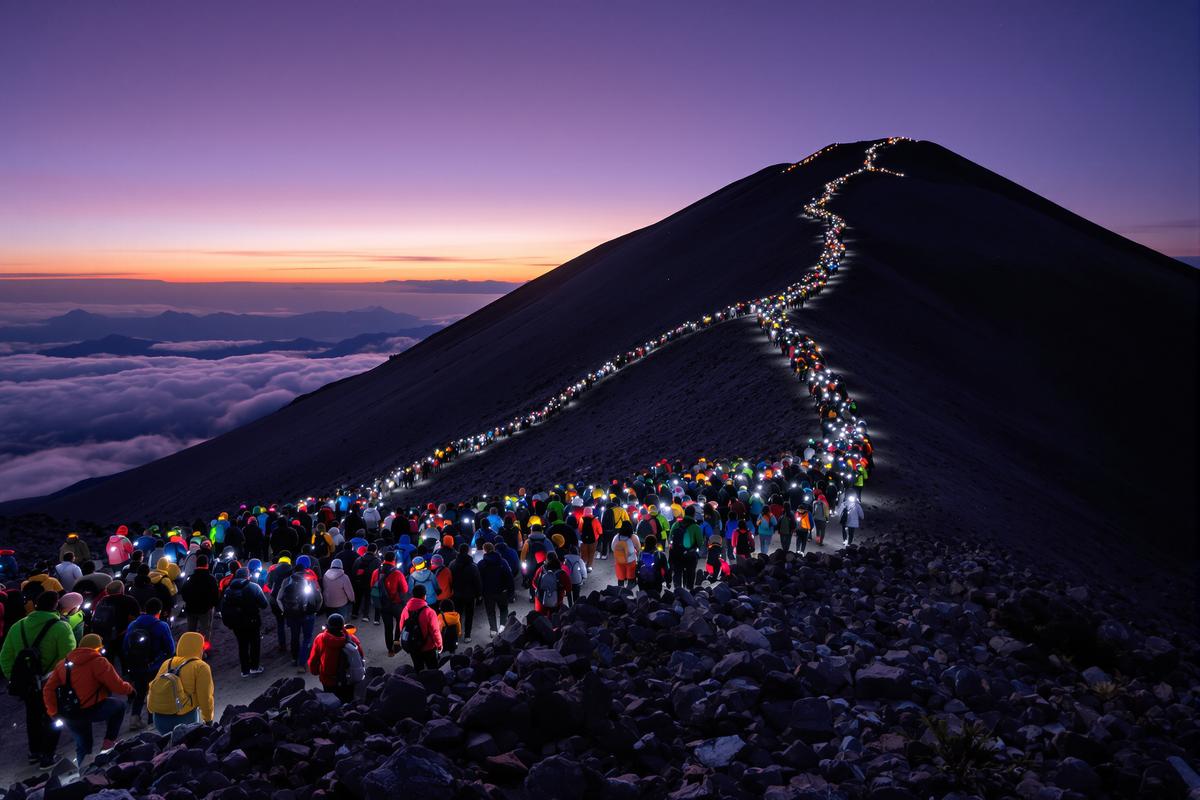 Mais ce succès a un revers. Contrairement à l’image de sérénité qu’on associe souvent au Mont Fuji, les sentiers sont aujourd’hui encombrés de monde. À certains moments, particulièrement vers 2h du matin, les pentes se changent en une file ininterrompue de randonneurs armés de lampes frontales. Une véritable « autoroute humaine ».