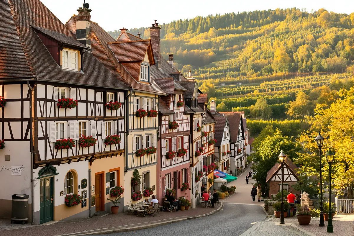 Les maisons à colombages aux poutres apparentes s’alignent avec une précision charmante, ornées de géraniums éclatants. Ce cadre digne d’une carte postale offre une ambiance bien plus calme et intimiste que ses voisins plus connus.