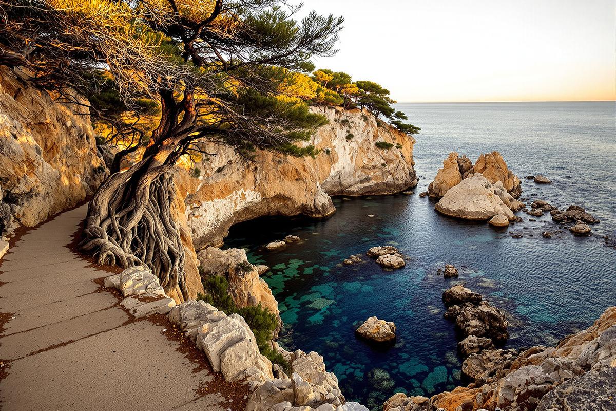 Ici, les pins maritimes s’accrochent désespérément aux falaises. Leurs ombres dansent sur les rochers, dessinant des jeux de lumière presque irréels. Une simple promenade suffit pour sentir l’odeur de thym, de romarin et de lavande sauvage mêlée à l’air salin. Chaque pas est une immersion sensorielle.