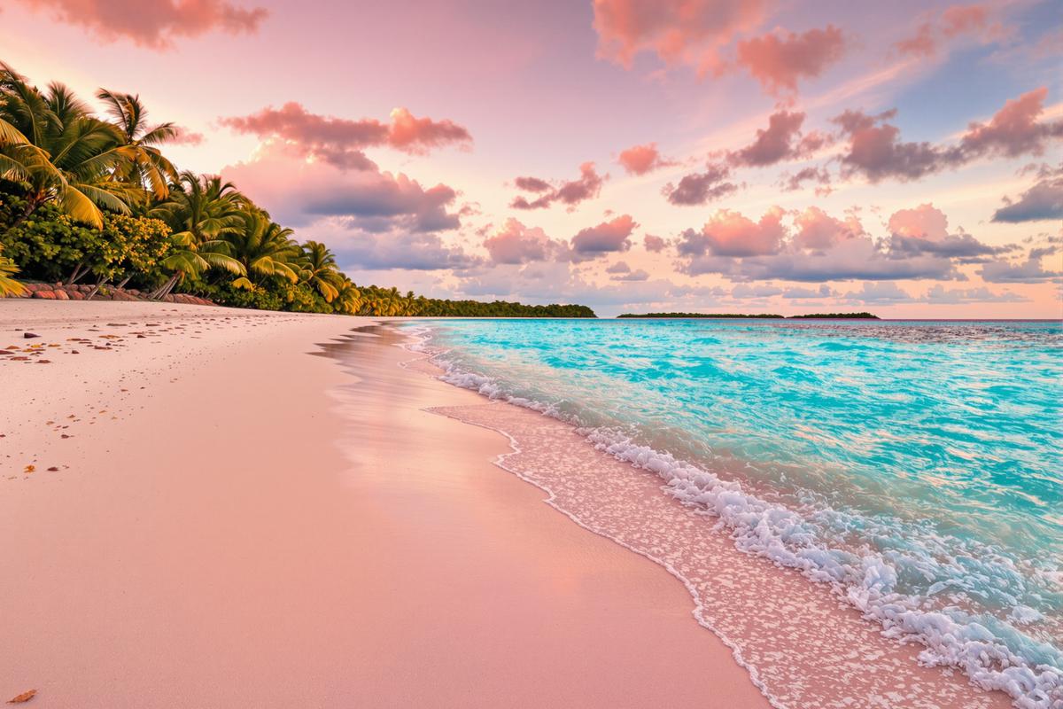À l’arrivée, une plage sauvage s’étire doucement, parsemée de sable rosé. Cette teinte rare ne vient pas de pigments artificiels, mais d’un phénomène naturel surprenant : des fragments de corail, polis par les vagues, qui deviennent rose pâle sous les rayons du soleil.