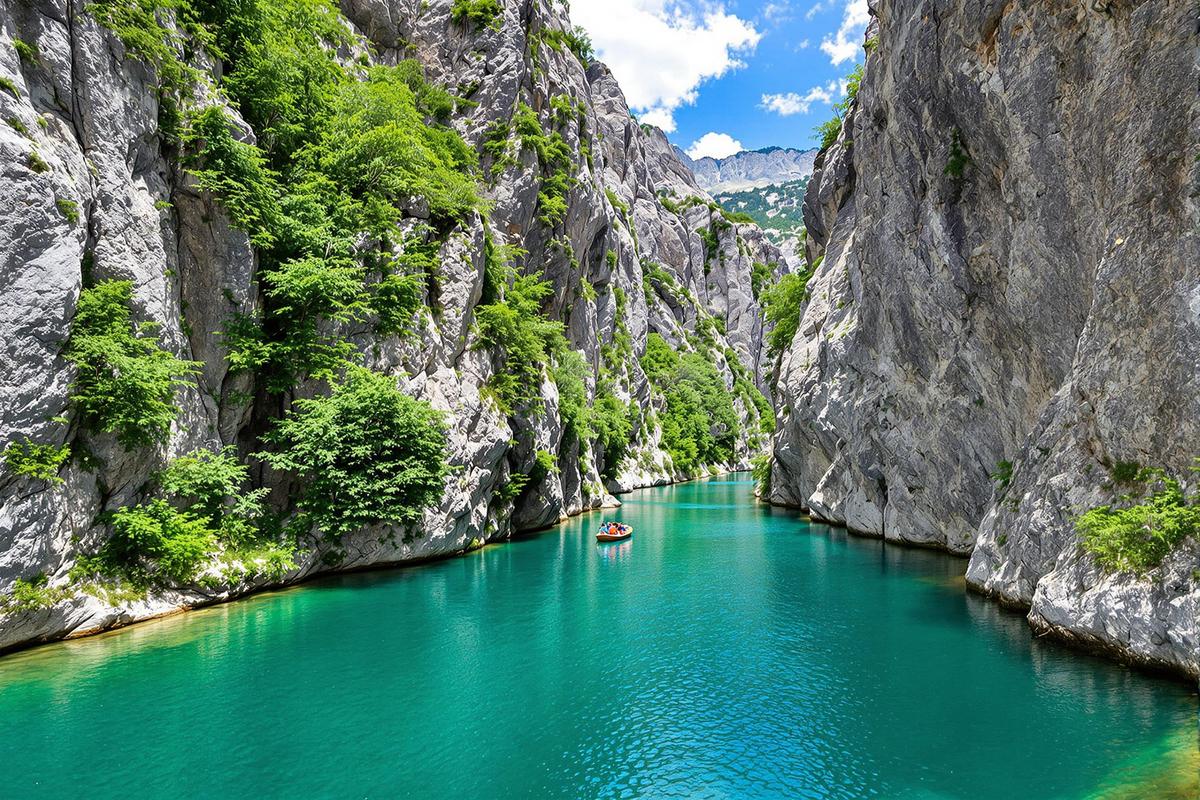 La rivière Shala, nichée au nord de l’Albanie, serpente entre de hautes montagnes escarpées. Elle traverse un canyon spectaculaire qu’on surnomme affectueusement la “Thaïlande albanaise”. Pourquoi ? À cause de ses eaux cristallines aux reflets bleu lagon, entourées de falaises vertigineuses et d’une nature brute, intacte.